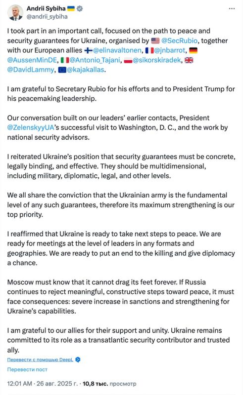 Глава МИД Украины Сибига подтвердил участие в этих переговорах и изложил требования украинской стороны.