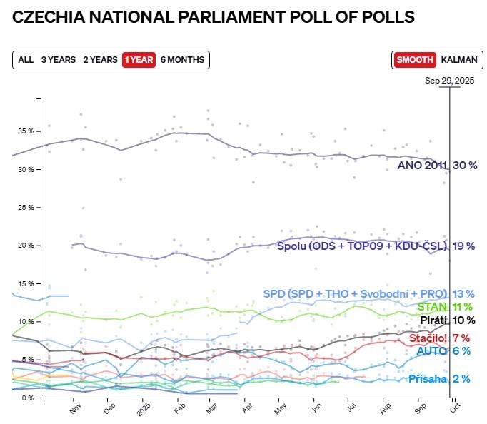 Партия Бабиша ANO имеет 30% поддержки, блок премьера Петра Фиалы 19%, а националисты из SPD — 13%.