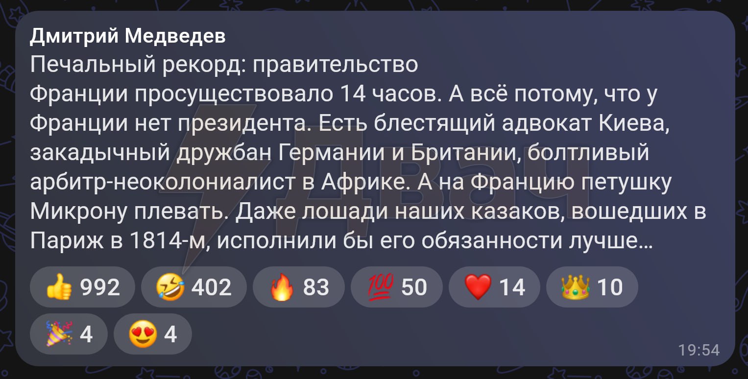 Медведев жёстко прошёлся по Макрону, обозвав его петушком Микроном и заявил, что лошади русских казаков, вошедших в Париж в 1814-м, исполнили бы его обязанности как президента лучше.