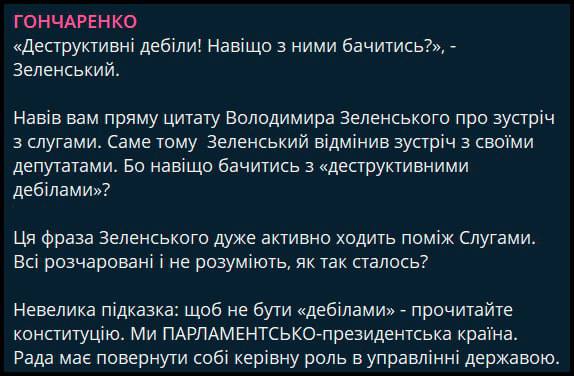По словам депутата Рады Гончаренко, Зеленский в ярости обозвал своих же соратников «деструктивными дебилами» и даже отменил встречу с ними.