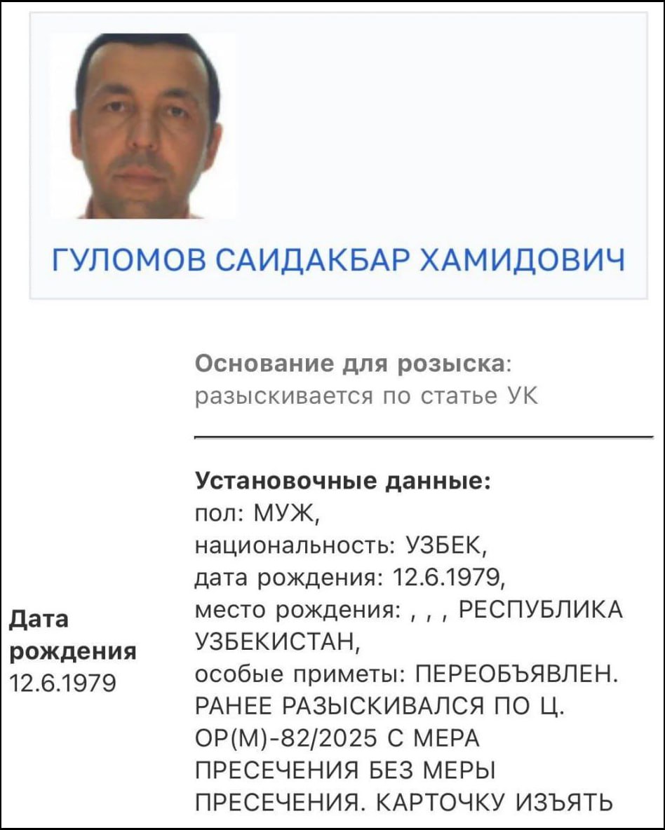 Саидакбар Гуломов, осуществлявший вербовку исполнителей для терактов против офицеров МО РФ, переобъявлен в федеральный розыск.