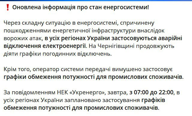 "Экстренные отключения введены по всей стране, кроме Черниговской области, где действуют графики отключений", — сообщает Минэнерго.