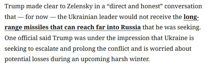 "Беседа двух президентов была «напряженной, откровенной, а временами неудобной». В ходе нее Трамп дал понять Зеленскому, что Украина сейчас не получит ракеты большой дальности" — пишут западные журналисты.