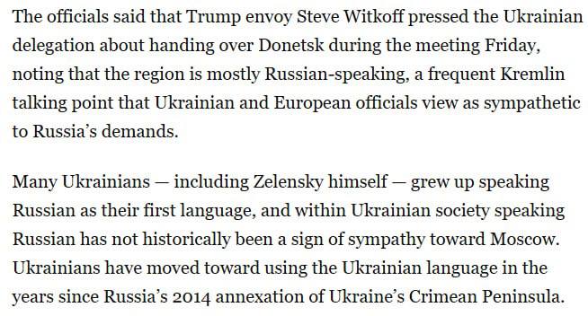 Давление на Зеленского: Уиткофф, как пишут, давил на украинскую делегацию, ведь ДНР это русскоязычный регион.