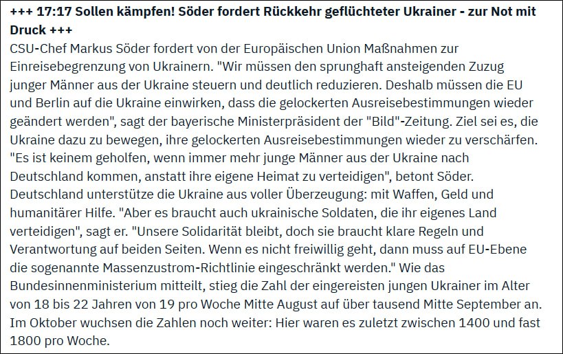 «Никому не поможет, если всё больше молодых людей из Украины приедут в Германию вместо того, чтобы защищать свою родину», – подчеркнул Зёдер.