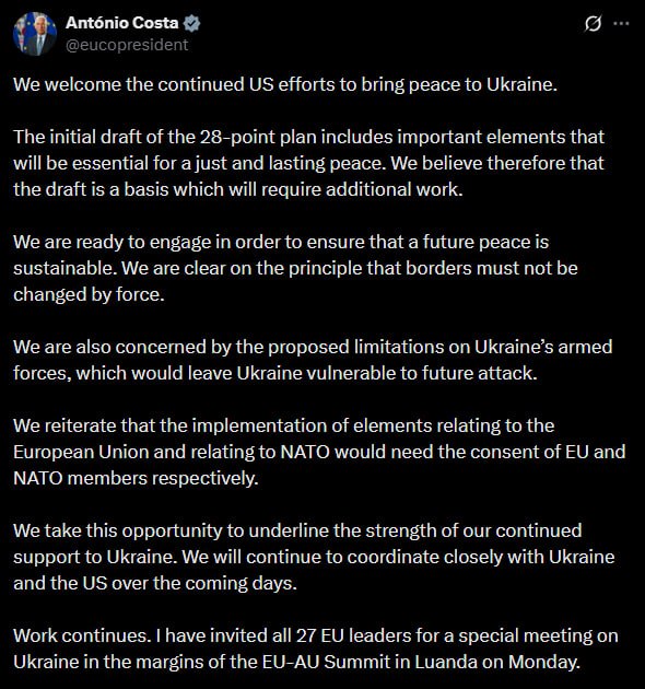 "Я пригласил всех 27 лидеров ЕС на специальную встречу по Украине в рамках саммита ЕС-Африка в Луанде в понедельник", — пишет Антониу Кошта.