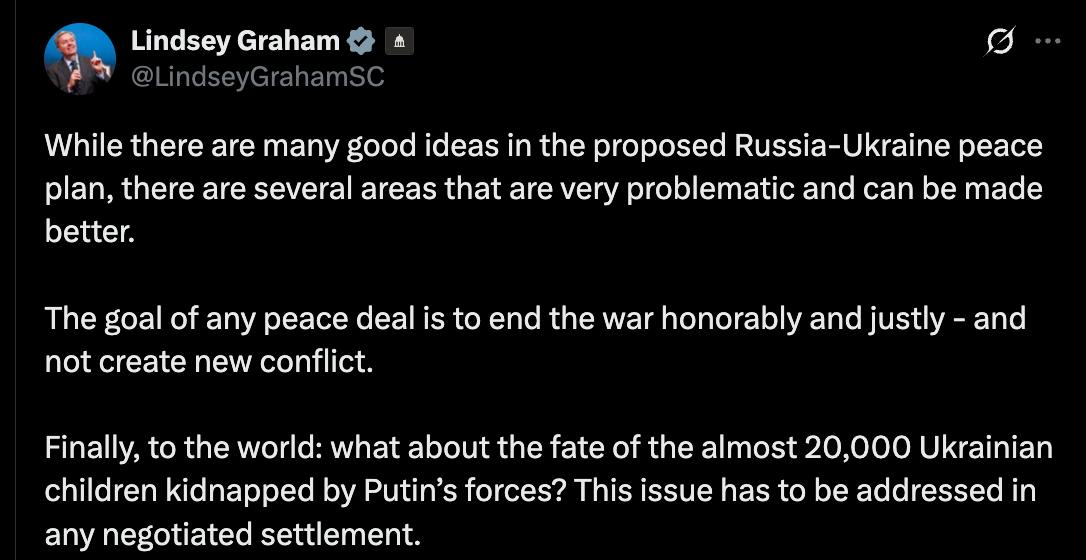 "Есть несколько весьма проблемных моментов, которые можно улучшить. Целью любого мирного соглашения является достойное и справедливое завершение войны, а не создание нового конфликта", — пишет сенатор Линдси Грэм.