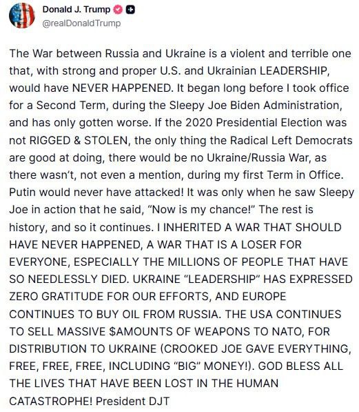 «Война между Россией и Украиной — жестокая и ужасная, и при сильном и правильном руководстве США и Украины она бы никогда не случилась. Она началась задолго до того, как я вступил в должность во второй раз, при администрации Сонного Джо Байдена, и лишь ухудшалась», - отмечает американский президент.