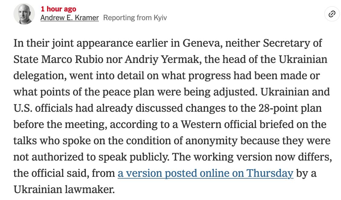 «Украинские и американские официальные лица уже обсуждали изменения в 28-пунктовом плане до встречи… Рабочая версия теперь отличается от версии, опубликованной в четверг в интернете украинским депутатом», - пишет New York Times со ссылкой на западного чиновника.