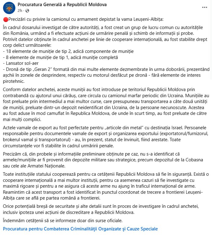 20 ноября на таможне Леушены-Албица был обнаружен грузовик с боеприпасами, разобранным беспилотником «Герань 2» и пусковой установкой "земля-воздух".