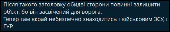 "После такого заголовка обе стороны должны покинуть объект, потому что он засвечен для врага. Теперь там крайне опасно находиться и военнослужащим ВСУ, и ГУР", — заявила экс-замминистра обороны Маляр.