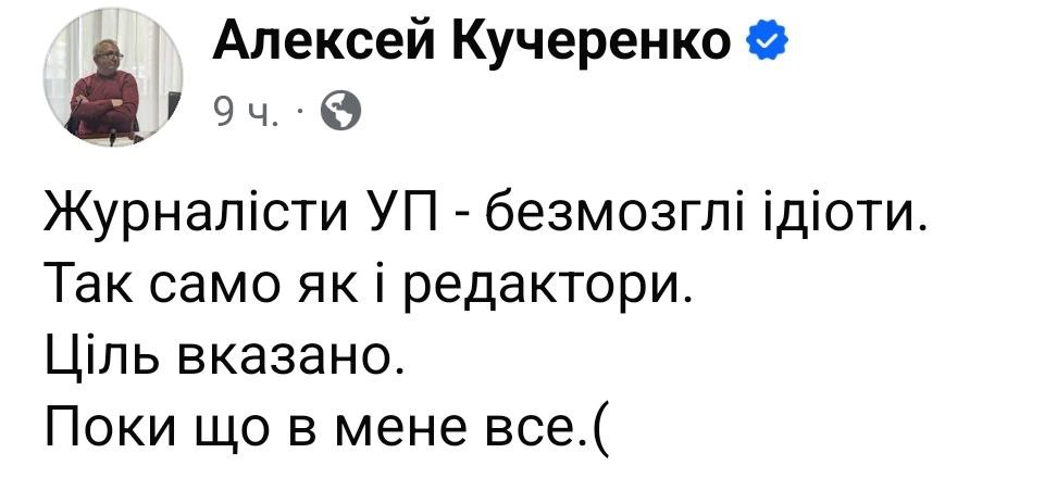 "Журналисты УП (укроСМИ) - безмозглые идиоты. Так же, как и редакторы. Цель указана. Пока что у меня все", — написал он.