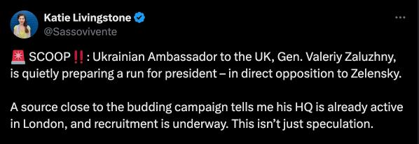 Политтехнолог Игорь Гринев (бывший глава штаба Петра Порошенко) уже открыто заявляет, что "во втором туре победит Залужный" и его "невозможно остановить". Аналитики считают, что это указывает на реальную конфигурацию: намечается тандем Президент Залужный — Премьер Порошенко. Последний, по этой схеме, становится главным спонсором кампании и через лояльного президента возвращает себе рычаги влияния и контроль над финансовыми потоками.