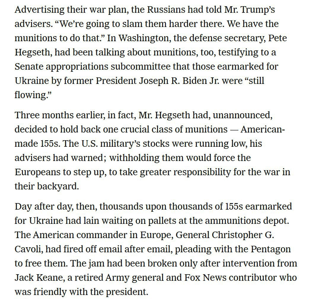 Пит Хегсет в марте 2025 года в одностороннем порядке и без публичного предупреждения заблокировал отправку в Украину тысяч 155-мм артиллерийских снарядов, ранее утверждённых администрацией Байдена.
