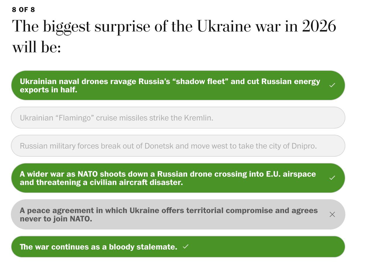 При этом он прогнозирует, что война продолжится и станет "тупиком", но армия России приблизится к Днепропетровску. И произойдет расширение войны после того, как НАТО собьёт российский БПЛА, который пересечёт воздушное пространство ЕС и создаст угрозу катастрофы с гражданским самолётом.