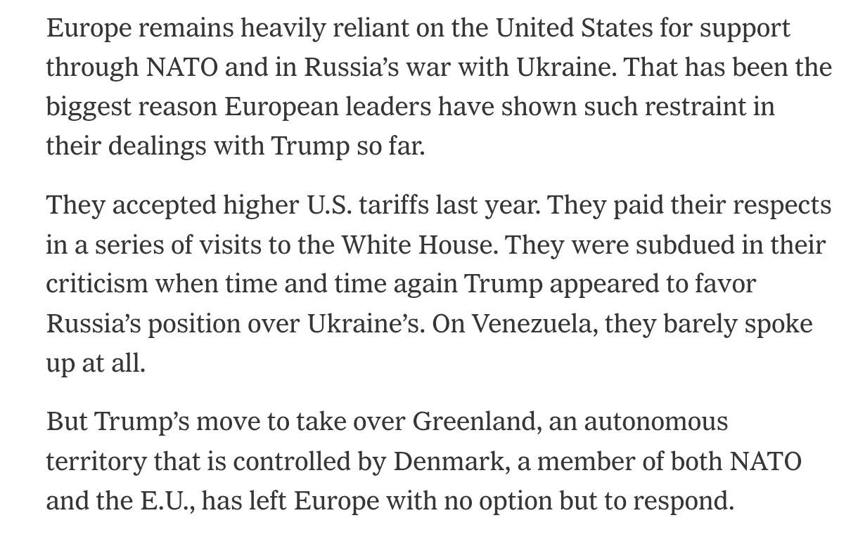 И США жизненно важны для обороны Украины. Однако Гренландия изменила расчеты. Действия Трампа по захвату Гренландии, автономной территории, контролируемой Данией, членом НАТО и ЕС, не оставили Европе иного выбора, кроме как отреагировать.
