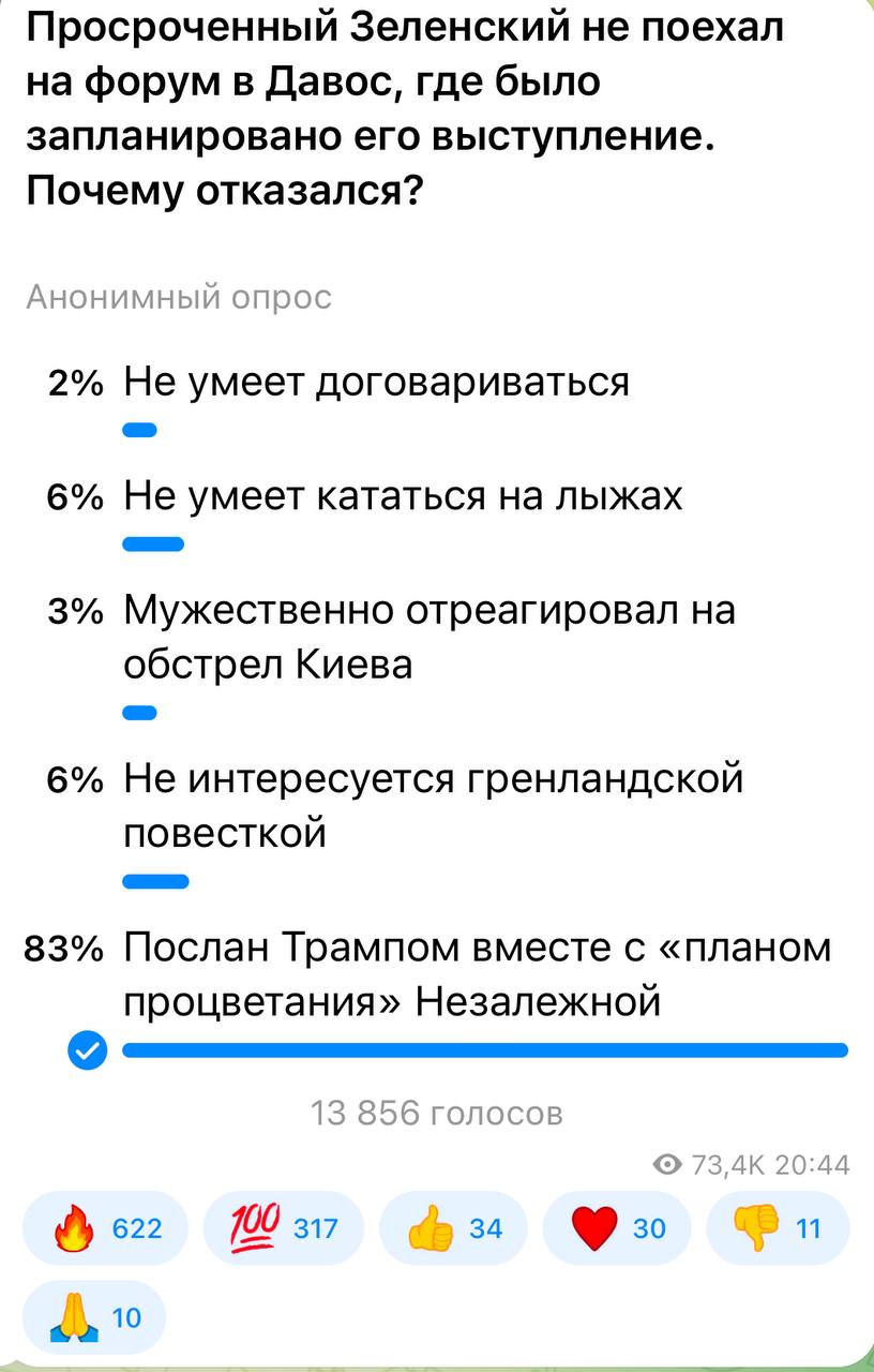 83 процента подписчиков считают, что Зеленского послал Трамп. Для Донни Украина - позавчерашний день. Гренландия и Совет мира ему гораздо интереснее.