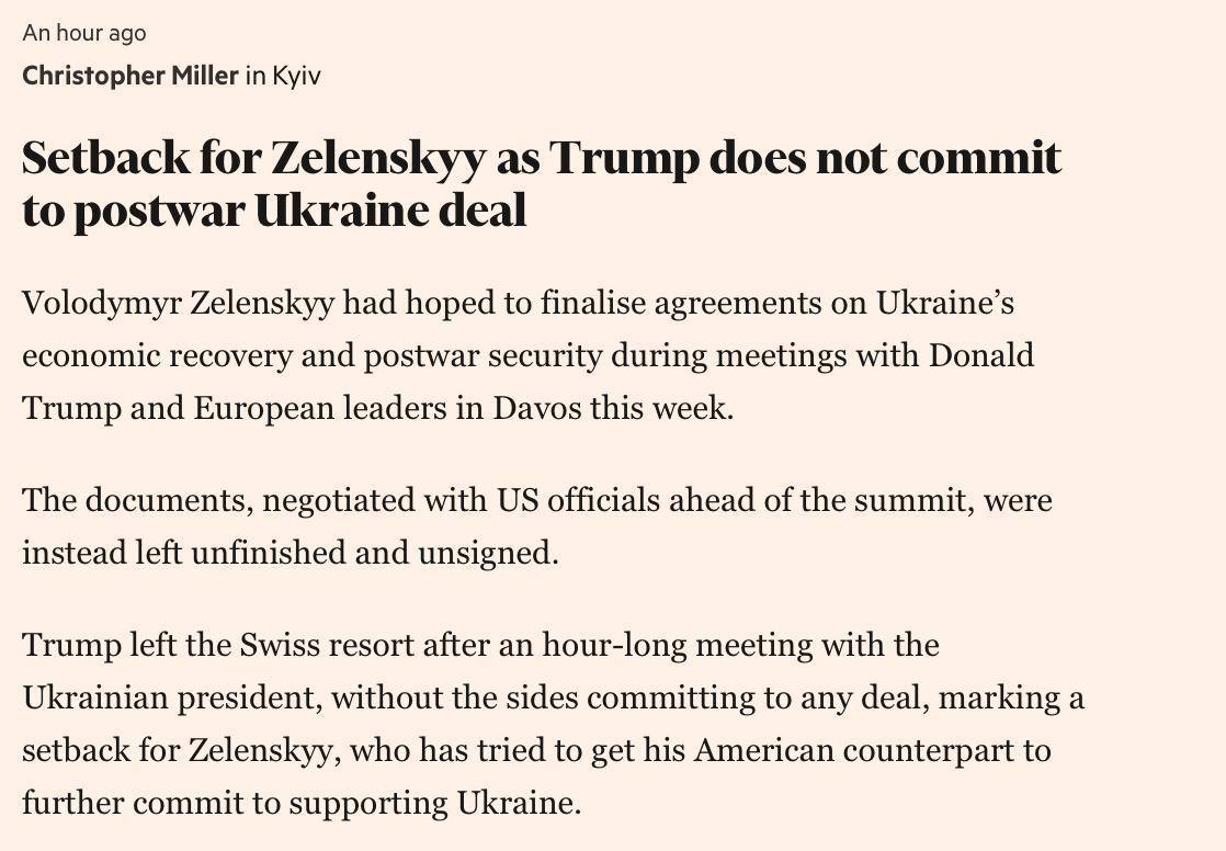Трамп покинул Давос после часовой встречи с Зеленским, «стороны не взяли на себя никаких обязательств по сделке [по восстановлению Украины], что стало неудачей для Зеленского», пишет издание Financial Times.