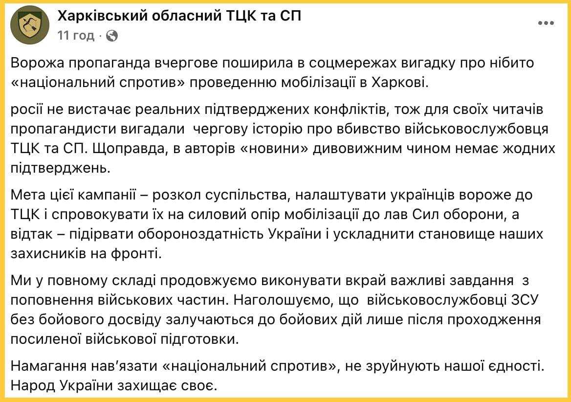 "РФ пытается настроить украинцев против ТЦК и спровоцировать их на силовое сопротивление мобилизации", – заявили в харьковской ячейке людоловов.