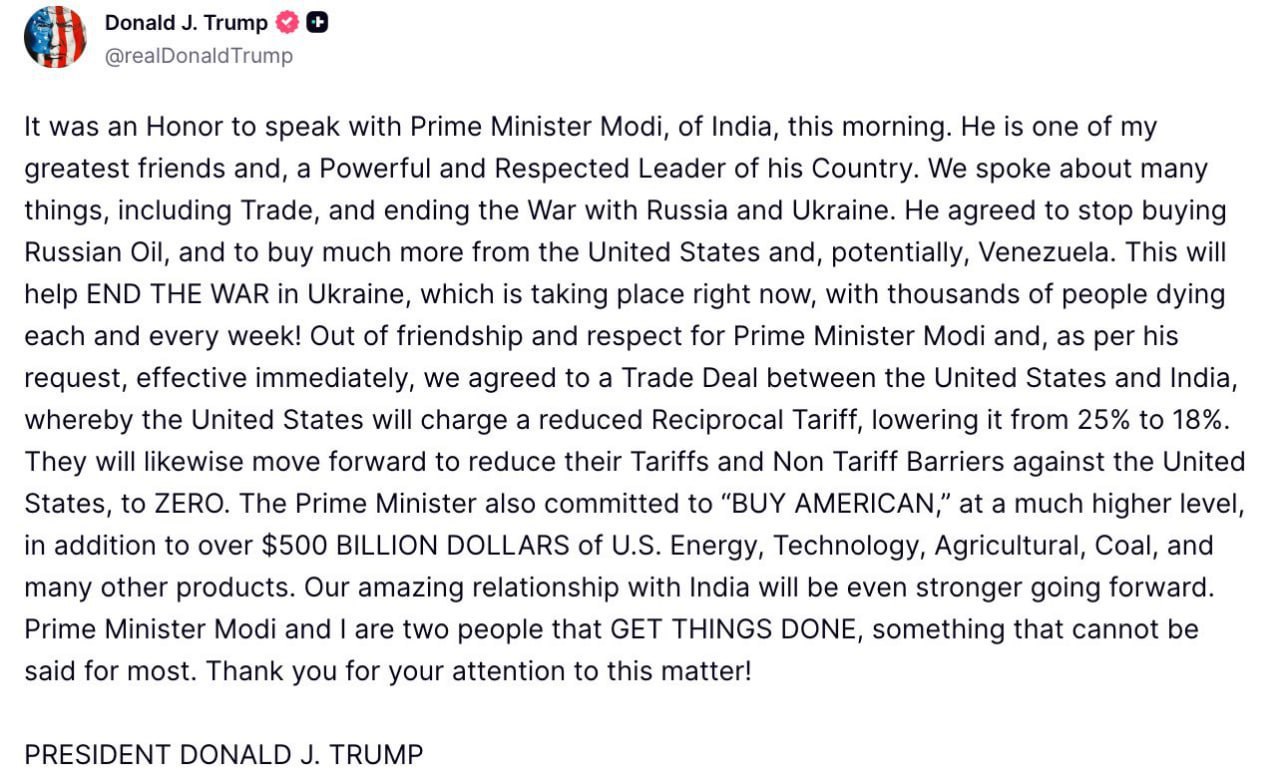 Параллельно стороны договорились о торговой сделке: США снижают пошлины на индийские товары с 25% до 18%.