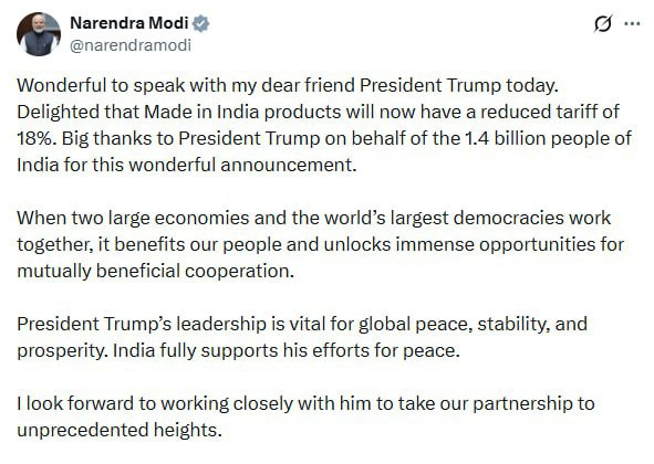 Моди ограничился благодарностью за снижение пошлин до 18% и общими комплиментами в адрес Трампа.