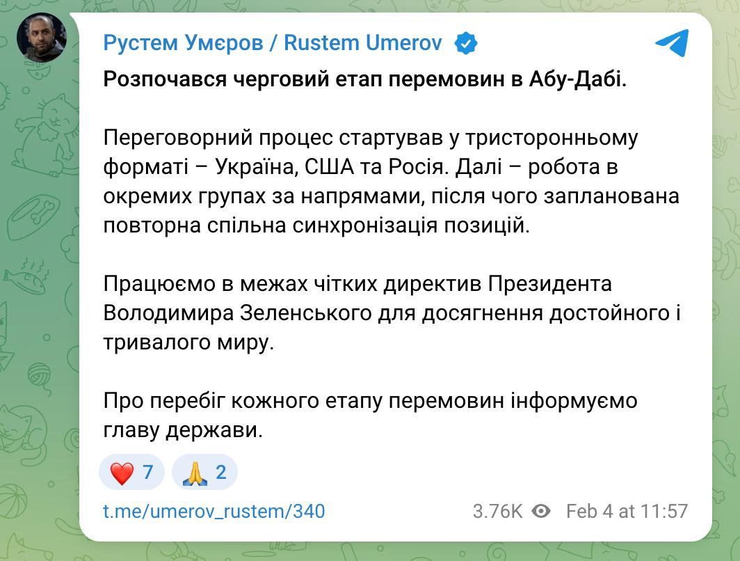 Глава украинской делегации Умеров заявил, что «Переговорный процесс стартовал в трехстороннем формате – Украина, США и Россия. Далее – работа в отдельных группах по направлениям, после чего планируется повторная совместная синхронизация позиций».