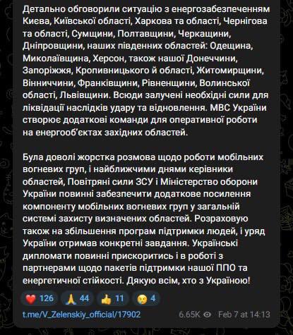«Был довольно жесткий разговор о работе мобильных огневых групп, и в ближайшие дни руководители областей, Воздушные силы ВСУ и Минобороны должны обеспечить дополнительное усиление компонента мобильных огневых групп в общей системе защиты определенных областей», - сказал Зеленский.