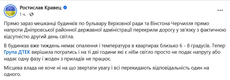 На улице Уинстона Черчилля и на бульваре Верховной Рады в Киеве жители перекрыли дороги из-за отсутствия света и тепла, рассказал адвокат Ростислав Кравец.