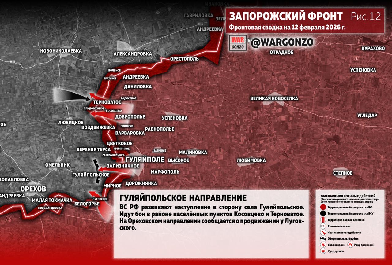 На Гуляйпольском направлении ВС РФ развивают наступление в сторону села Гуляйпольское. Идут бои в районе населённых пунктов Косовцево и Терноватое. На Ореховском направлении сообщается о продвижении у Луговского. (Рис. 1.2)