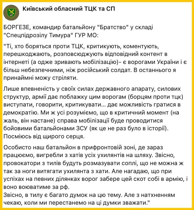Дословно: "В критический момент (к сожалению, он наступит) дело мобилизации будет проводиться боевыми батальонами ВСУ".