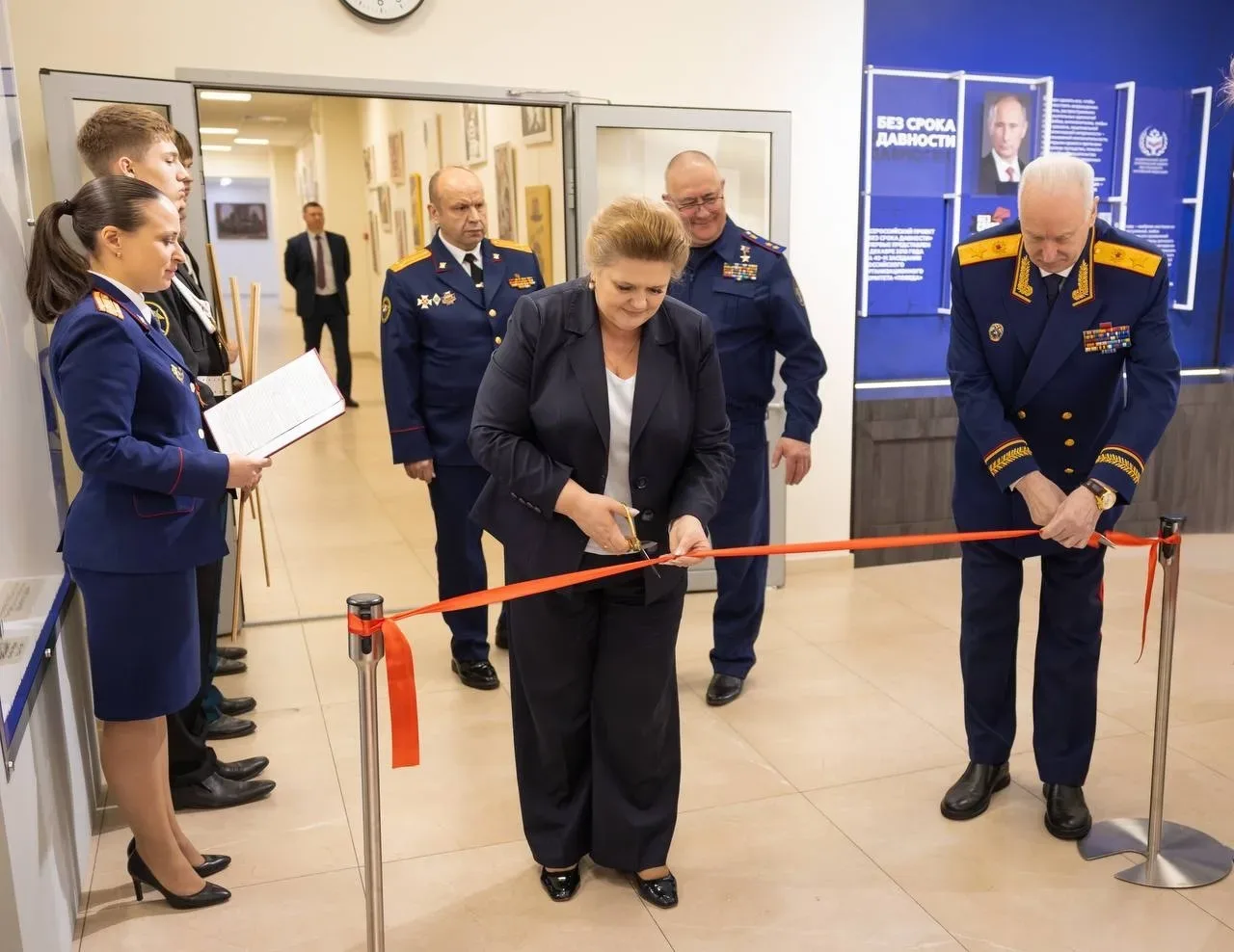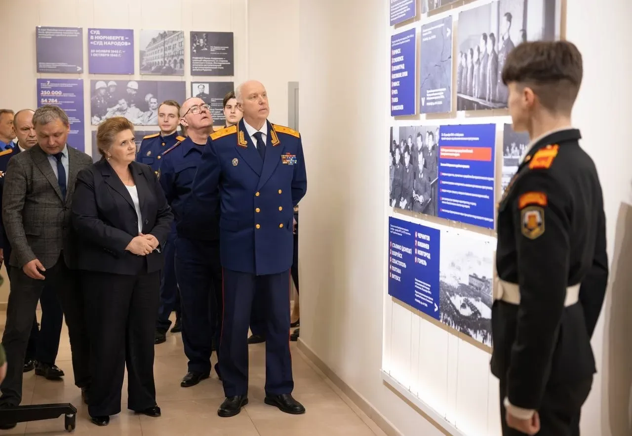 Председатель СК России А.И. Бастрыкин совместно с руководителем Национального центра исторической памяти при Президенте Российской Федерации Е.П. Малышевой открыли в ведомстве экспозицию, посвященную Нюрнбергскому процессу над немецко-фашистскими захватчиками и их пособниками и просветительскому проекту «Без срока давности». Мероприятие приурочено ко Дню памяти жертв геноцида советского народа, совершенного нацистами и их пособниками в период Великой Отечественной войны 1941–1945 годов, а также к 81-й годовщине Победы. В нем приняли участие руководитель управления общественно-политической работы Герой России С.В. Петров, сотрудники центрального аппарата ведомства, курсанты Московской академии СК России им.А.Я. Сухарева и Военного университета им.князя Александра Невского Министерства обороны РФ, учащиеся кадетского класса СК России.
