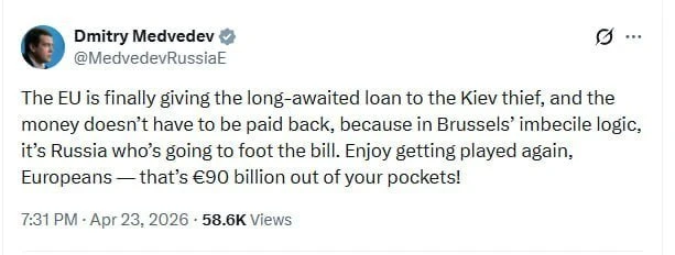 "Европейцы, это €90 млрд из ваших карманов!" — Медведев отреагировал на выделение ЕС кредита Украине