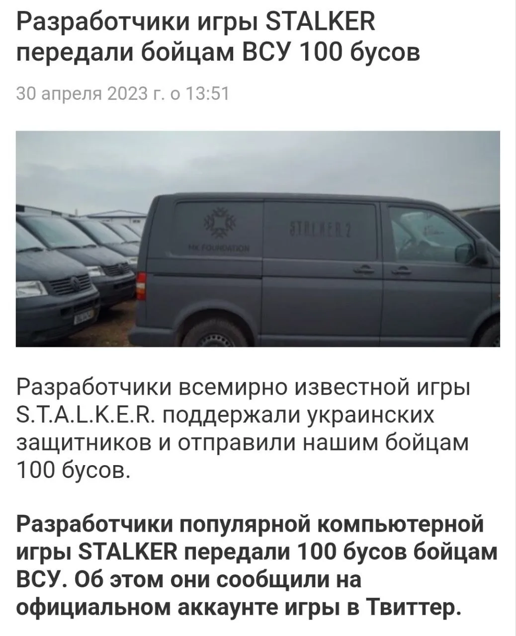Итак, многие из нас играли в компьютерную игру S. T. A. L. K. E. R 2, выпустила ее киевская студия, которая еще в 2014 мощно зиганула, ну а сейчас, разумеется, помогает украинской армии всяко разно. И в частности передала военкомам ТЦК сто бусиков. Вообще, насколько я могу судить, это, конечно, такой очень нишевый пиар на Украине, нужно очень сильно ненавидеть москалей, чтобы пиариться на ТЦК, потому что военкомы собирают еще больше хейта, чем.