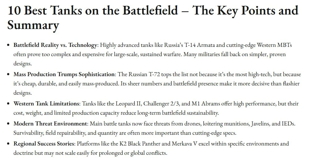 "Т-72, несмотря на беспилотники и другие трудности, с которыми ему пришлось столкнуться, выигрывает войну против Украины для России. Это делается не изящно, но свою задачу он выполняет. Именно поэтому это лучший танк в мире на сегодняшний день", — пишет издание.