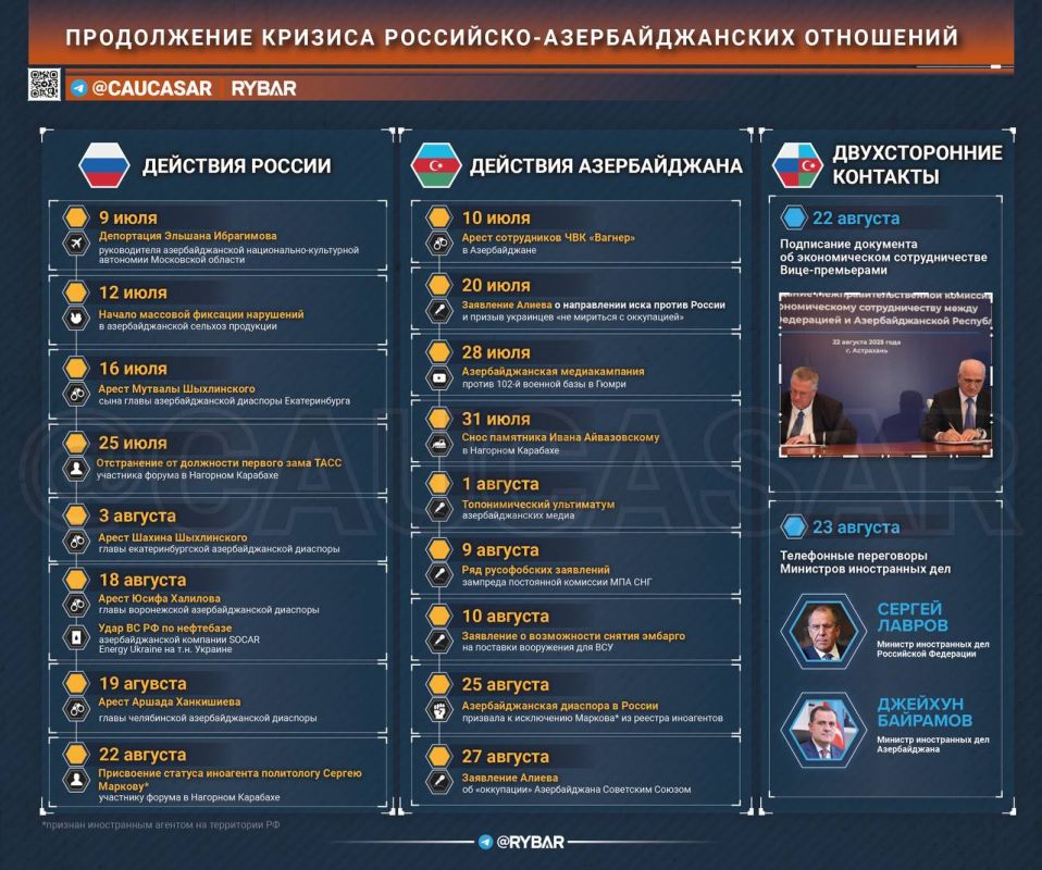 Хронология российско-азербайджанского противостояния Активная фаза конфликта между Россией и Азербайджаном сошла на нет, однако стороны по-прежнему вставляют друг другу палки в колеса: Россия продолжают наносить удары по диаспоральным структурам и...