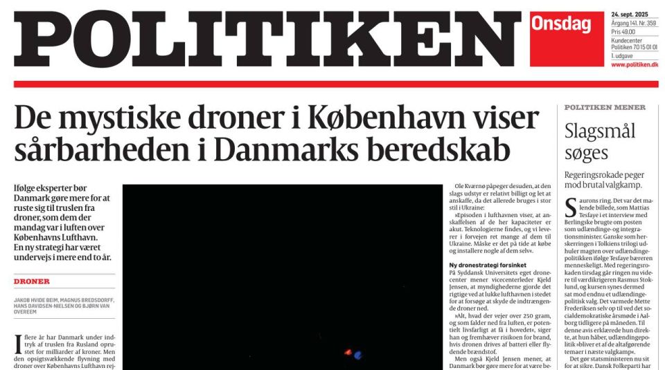 «Мистические дроны в Копенгагене демонстрируют уязвимость готовности Дании». Это - первая полоса газеты Politiken.Вообще, забавно сегодня читать датскую прессу, которая пытается понять, что это летало над ними и почему датская оборона оказалась не...
