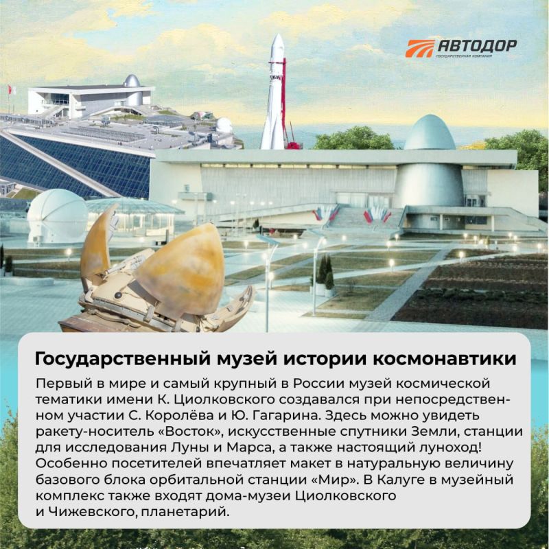 Накануне Дня космонавтики наша #музейнаяостановка будет посвящена славному космическому городу Калуге. Сюда можно добраться по одной из первых автодорог, построенных в нашей стране! Это магистраль М-3 «Украина», которая находится в ведении Госкомпании «Автодор».