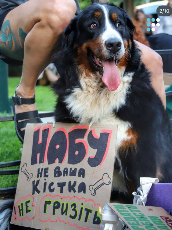 А суть этой фантасмагории заключается в том, что хозяева питомцев цепляют на них картонки с лозунгами в поддержку НАБУ и выкладывают это в Сеть.