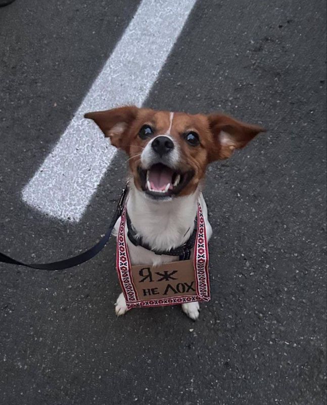 Пэрэмога, людэ! Пэрэмога! Собачка ходит с картонкой. Точно будет пэрэмога над коррупцией.
