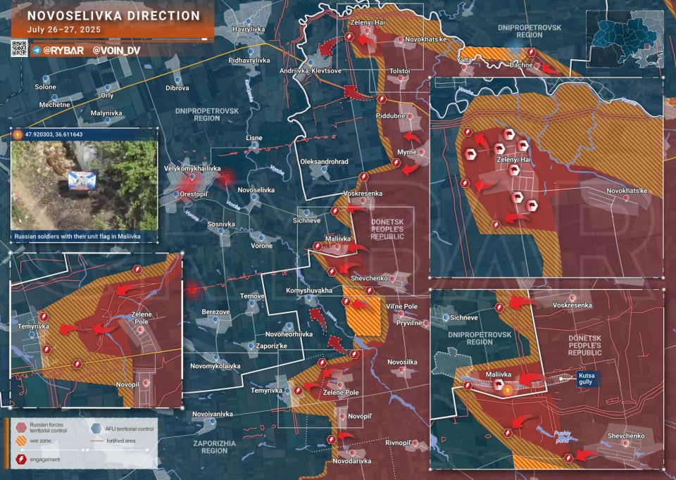 А на Новоселовском направлении бойцы «Востока» освободили Зеленый Гай, Малиевку и наступают в направлении Темировки, Камышевахи и Андреевки – Клевцово.