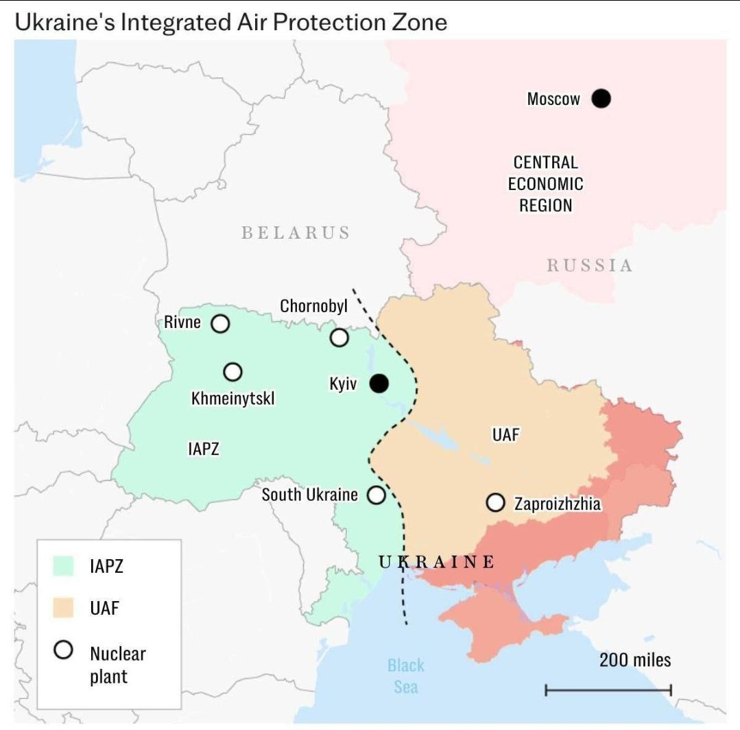 Британская газета "The Telegraph" сообщает, что НАТО планирует развернуть свою систему ПРО, способную перехватывать российские ракеты и дроны над западной и центральной Украиной. На карте эта зона обозначена зеленым цветом.