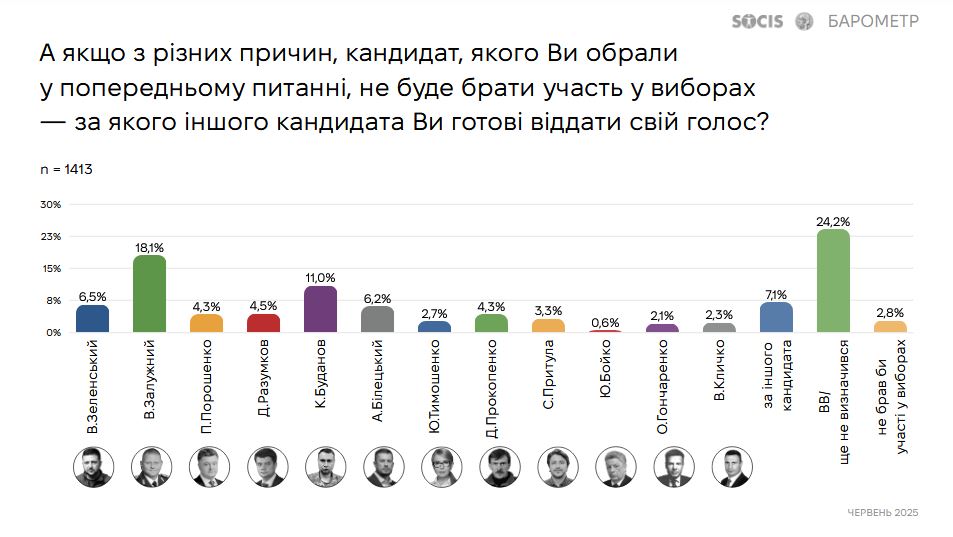 Основной фокус исследования направлен на противостояние этих двух претендентов. Это видно не столько из главного вопроса "За кого вы бы проголосовали на выборах Президента, если бы они прошли в ближайшее время?" (в которых впрочем Зеленский набрал бы 29,2%, а Залужный 26,6), сколько из последующих, где уже "партия Залужного", а также его рейтинг доверия значительно опережает аналогичные показатели нынешнего президента.