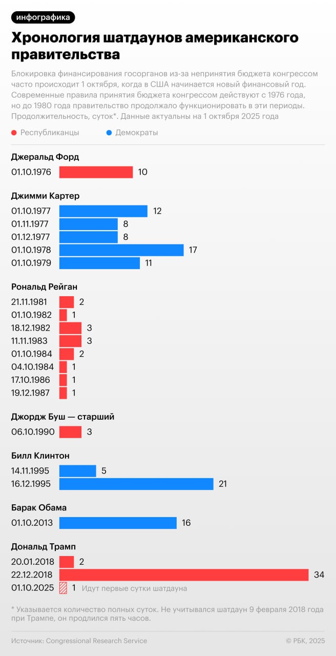 В первый президентский срок Трампа правительство США дважды приостанавливало работу — суммарно на 36 суток. Дольше госорганы не работали только при Джимме Картере — 56 суток.