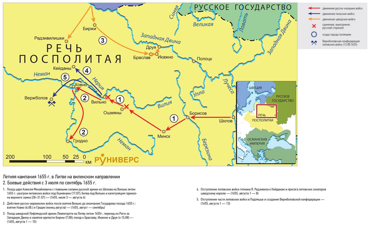 Однако если соизмерять результаты кампании с ее изначальными целями, то нельзя говорить о полной удаче. Ведь царь планировал дойти до Варшавы и принудить польского короля Яна-Казимира к выгодным условиям мира. Но заметную роль в том, что эти планы не сбылись, сыграл внешний фактор – летом 1655 в Польшу вторглась Швеция, которая в то время была сильнейшей военной державой Европы. К моменту, когда царь объявил об окончании государева похода, шведы уже взяли Варшаву и Краков, а на их сторону переходила часть польской аристократии, видя в них силу, которая поможет справиться с русскими.