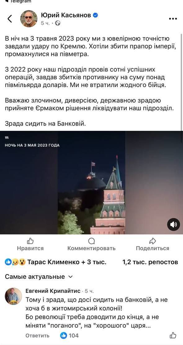 «В ночь на 3 мая 2023 года мы с ювелирной точностью нанесли удар по Кремлю. Хотели сбить флаг империи, промахнувшись на полметра. С 2022 года наше подразделение провело сотни успешных операций, нанесло ущерб противнику на сумму более полумиллиарда долларов. Мы не потеряли ни одного бойца. Считаю преступлением, диверсией, государственной изменой принятое Ермаком решение ликвидировать наше подразделение. Измена сидит на Банковой», – написал Касьянов.