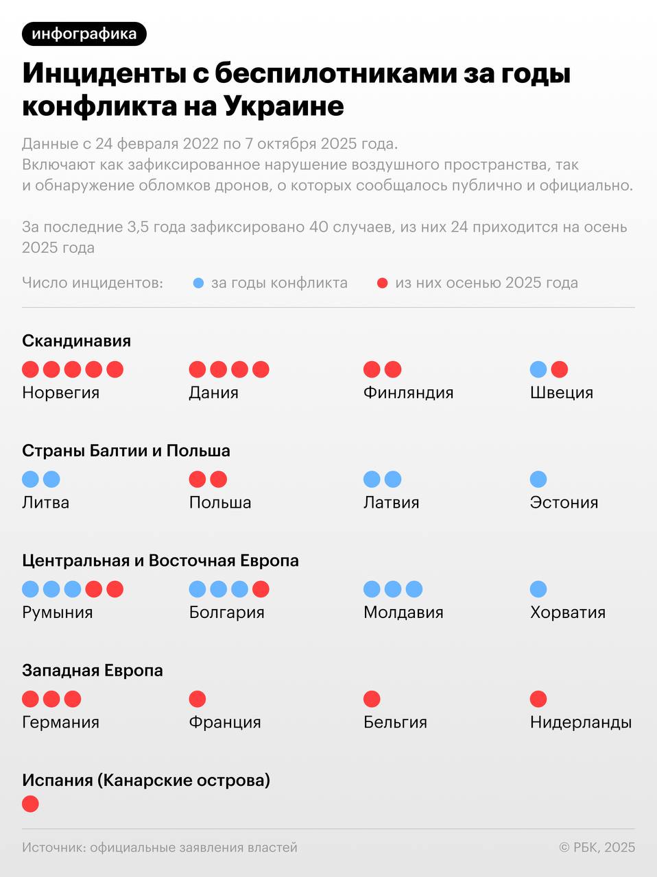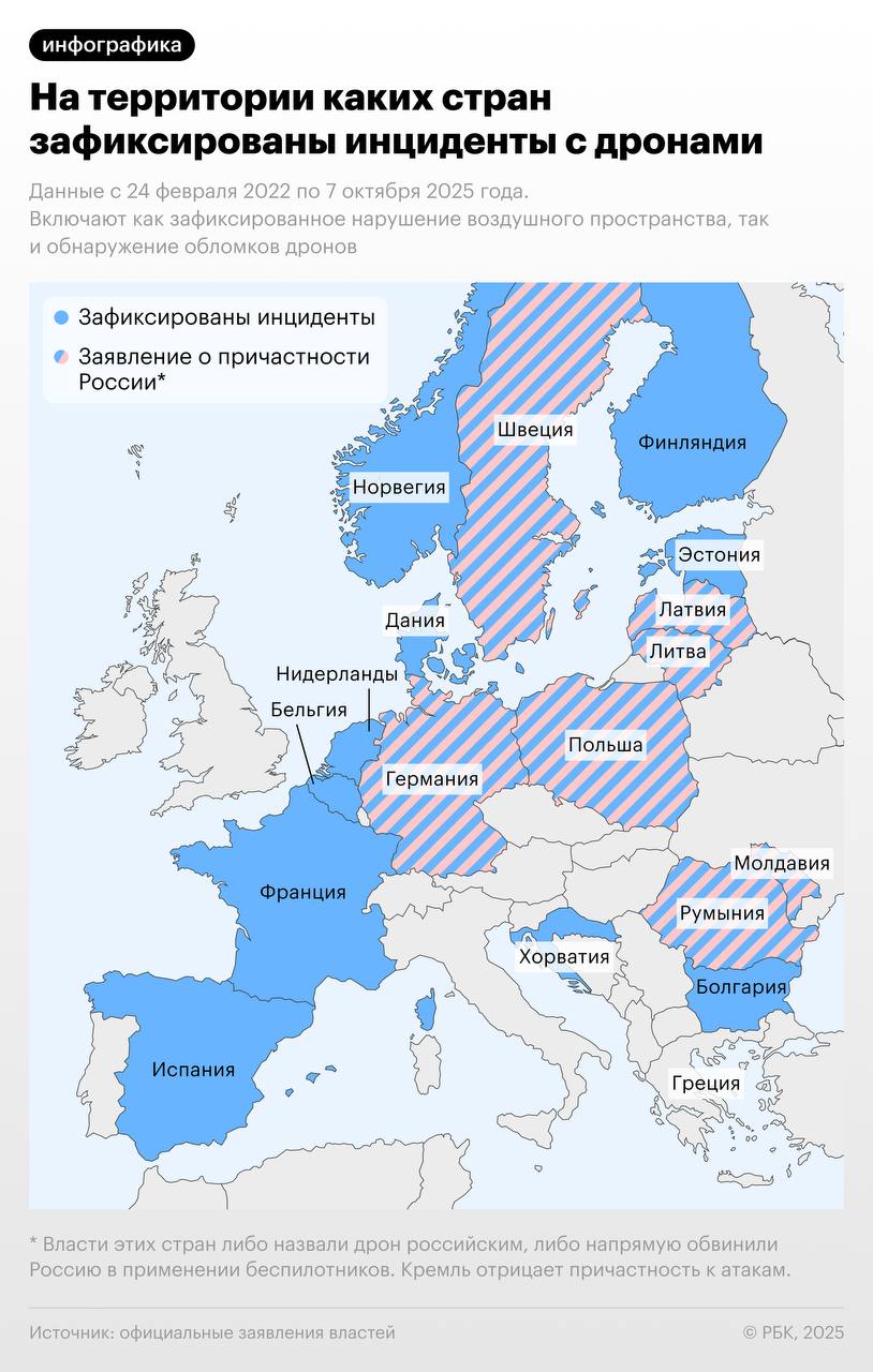 С середины сентября власти европейских стран стали сообщать о инцидентах с дронами, нарушившими их воздушное пространство. В некоторых государствах, включая Польшу, страны Балтии и Германию, утверждали, что за этим может стоять Россия.