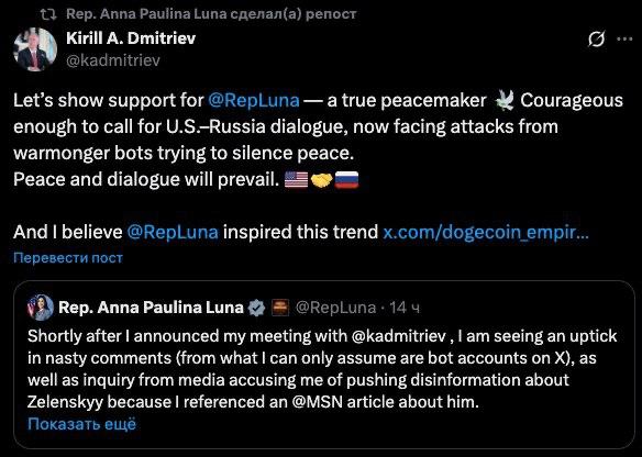 «Давайте выразим поддержку Анне Паулине Луне — настоящему миротворцу достаточно смелому, чтобы призвать к диалогу между США и Россией, теперь сталкивающемуся с атаками ботов-подстрекателей войны, пытающихся помешать миру. Мир и диалог восторжествуют. И я верю, что Анну Паулину Луну вдохновил этот тренд».