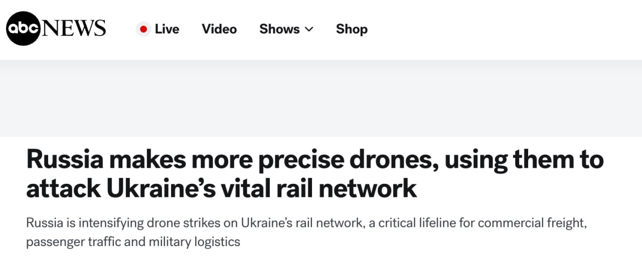 ABC News: Россия усилила атаки на железнодорожную сеть Украины — ключевую артерию для перевозки грузов и военной логистики.