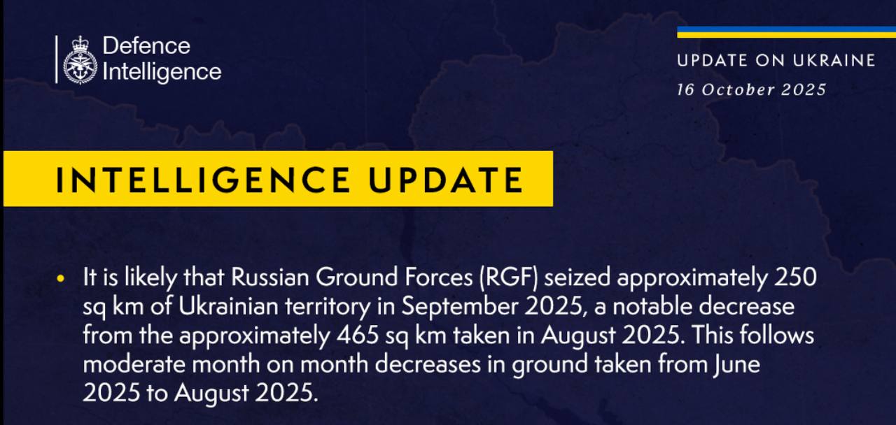 Разведка Британии сегодня радостно сообщает: в сентябре Армия России заняла «всего» 250 кв км территории Украины, что «гораздо меньше», чем в августе, когда мы освободили 465 кв км.