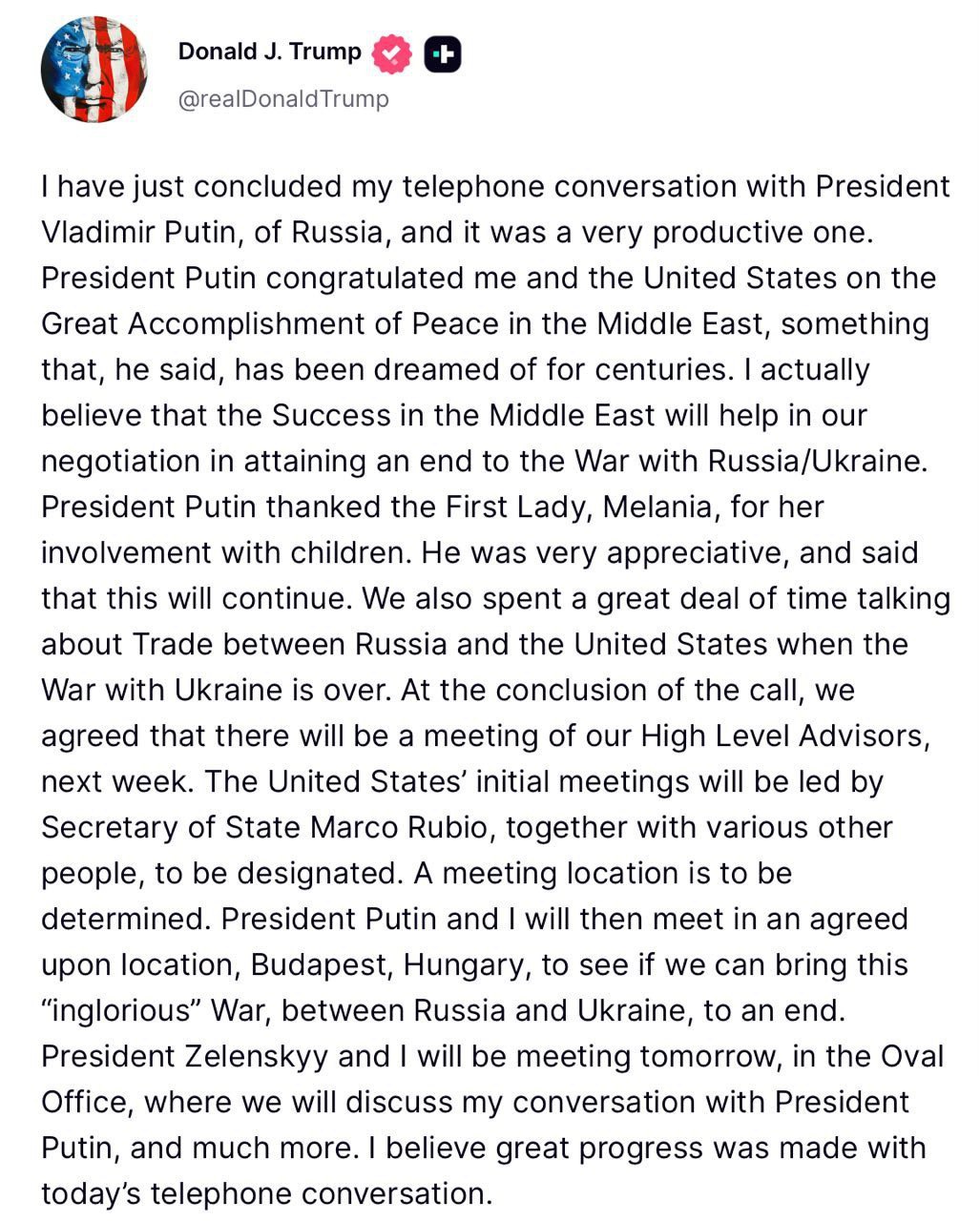 Владимир Путин провел двухчасовой телефонный разговор с Дональдом Трампом. Американский лидер в соцсетях заявил, что беседа была «очень продуктивной», и заявил, что лично встретится с российским президентом в Будапеште (столица Венгрии). Уже завтра он обсудит этот разговор с Зеленским, который прибудет в Овальный кабинет.